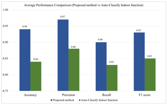 The experimental results classified the structural elements and the indoor clutter of the six datasets with an average accuracy of 0.94, an average precision of 0.97, an average recall of 0.90, and an average F1 score of 0.93. In addition, the proposed method yielded improved performances for all evaluation metrics in comparison to the Auto-Classify Indoor function of the commercial software, as shown in Figure 12. In particular, all the metrics from the parking lot dataset and the apartment 1 dataset were 0.96 or higher. The improved performance of the apartment 1 dataset was attributed to the set’s relatively low indoor complexity. Meanwhile, improved performance was observed in the case of the parking lot’s dataset (among all datasets), despite its high indoor complexity.
