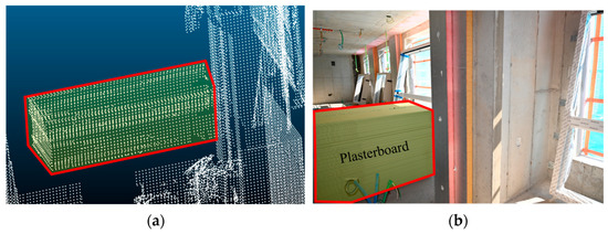 The proposed method yielded higher performance than the feature-based Auto-Classify Indoor function; this can be explained using Figure 13. Figure 13a shows the point cloud that is classified into the indoor Auto-Classify function and the structural elements, and Figure 13b is the actual target object. The highlighted area of Figure 13b is where the plasterboard was loaded on the floor. Therefore, it is appropriate to remove the plasterboard as indoor clutter objects. However, the point cloud of the plasterboard in the Auto-Classify Indoor function has vertical geometrical features, such as the wall, and it has therefore been classified as structural elements. Thus, the proposed method can operate powerfully even for indoor clutter objects with geometrical features similar to those of the structural elements.