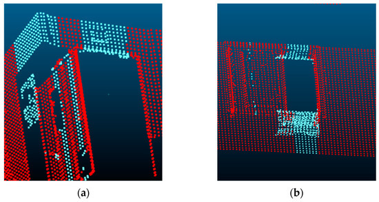 Examples of erroneous classifications of the point cloud at the window and door. (a) Point cloud classification results near the door of lecture room 2; (b) point cloud classification results near the windows of apartment 2 (red points: structural elements; cyan points: indoor clutter objects).