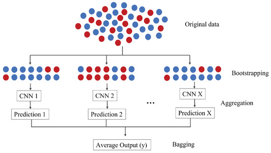 Figure 1. Example of the bagging algorithm where the blue and red dots represent the normal and abnormal images, with the CNN structures in the first experiment Alexnet, then VGG-16, and lastly with Inception. With the results, there is an averaging of predictions that results in the final voting.