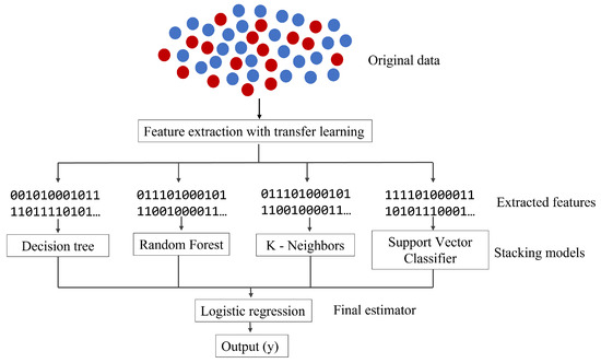 Figure 2. Example of the stacking ensemble where the blue and red dots represent the normal and abnormal images. The first part consists of a transfer learning method as a feature extractor that transforms the data set into a manageable format for machine learning algorithms. The second one contains the weak learners used for intermediate predictions, and the third one corresponds to the final estimator given by logistic regression.
