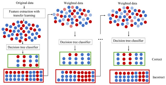 Figure 3. Example of the boosting algorithm, where the red and blue dots represent the normal and abnormal cases, and the green and red boxes represent the correct and incorrect predictions, respectively. As the model progresses, the decision tree classifier represents the weak learners, and the faded blue and red colors represent the images that have less weight because they have already been predicted correctly. In the same fashion as the stacking method, the first part represents transfer learning for feature extraction so the data set can be transformed into a more manageable state for ML algorithms. This process will iterate until the complete training data fit without error or to a specified number of estimators, which in our case is set to 200.