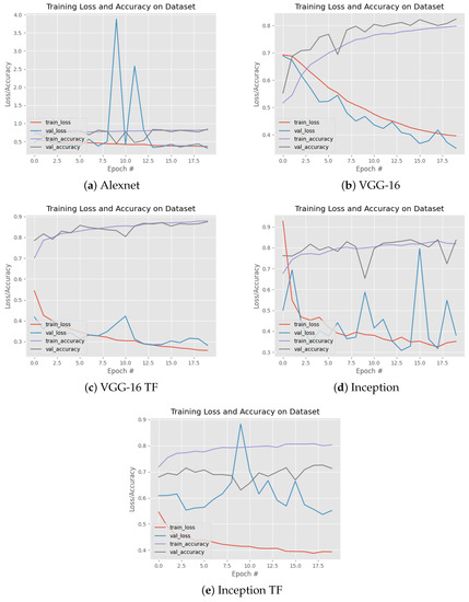 Figure 4. Detailed performance of the popular CNN architectures used in this study. Each image shows the accuracy and loss for each epoch in the training and validation process. Subfigures (ac) are related to the classical arquitectures, while subfigures (d,e) correspond to the ones with transfer learning.