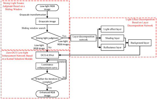 We suggest a low-light image enhancement method for electric power operation sites considering strong light suppression, which includes a strong light judgment based on a sliding window, light effect decomposition based on a layer decomposition network, and Zero-DCE low-light enhancement based on a kernel selection module. For the input low-light RGB image, a sliding window is used to search the image after grayscale transformation and judge the strong light region; the layer decomposition network is used to decompose the light effect of the strong light image and obtain the background layer after the removal of the light effect layer. The low-light enhancement of the background layer image is realized based on the Zero-DCE network of the kernel selection module. The overall flowchart of the low-light image enhancement method for electric power operation sites considering strong light suppression is shown in Figure 2.