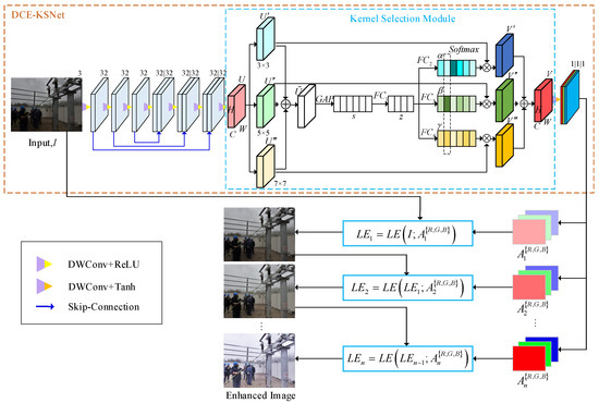 Zero-DCE low-light enhancement network framework based on a kernel selection module.
