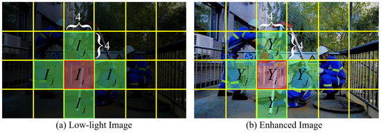 where K is the number of localized regions and Ω(i) is the four adjacent domains (up, down, left, and right) centered on region i. As seen in Figure 6, we set the size of the localized regions to 4 × 4; I and Y are the average intensity values of the localized regions in the input low-light image and the enhanced image, respectively.