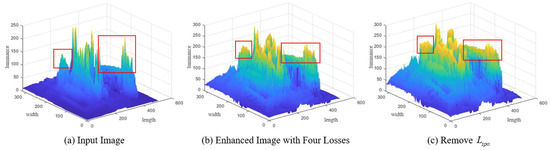 In order to prove the effectiveness of Lspa more objectively, the input original image, the image enhanced by including the four losses, and the image enhanced by removing Lspa were converted to double type and a mesh map luminance visualization was carried out using MATLAB. As shown in Figure 9, image (b) with Lspa included had a roughly similar luminance structure to the input original image (a), while image (c) with Lspa removed had a high overall luminance and a reduced contrast, which further demonstrated the importance of Lspa in preserving the differences in the neighboring regions between the input image and the enhanced image.