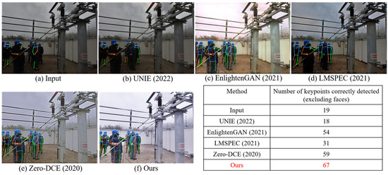 Comparative experiments with other state-of-the-art methods were performed on the SICE Part 2 public dataset and a private dataset of electric power job sites, respectively, to show the efficacy of our low-light enhancement method. Other state-of-the-art methods were selected as UNIE [13], EnlightenGAN [10], LMSPES [9], and Zero-DCE [12]. As the private dataset of the electric power operation site had no labels corresponding with the original image, it could not be judged by objective PSNR and SSIM indexes so the subjective visual effect and the number of correctly detected keypoints were used as the evaluation indexes. In terms of keypoint detection, we used Faster-RCNN [23] as a human detector and HRNet for keypoint detection. The comparison results are shown in Figure 10 and Figure 11, demonstrating the subjective visual enhancement effect and the number of keypoints correctly detected; thus, this paper’s method was superior to other state-of-the-art methods.