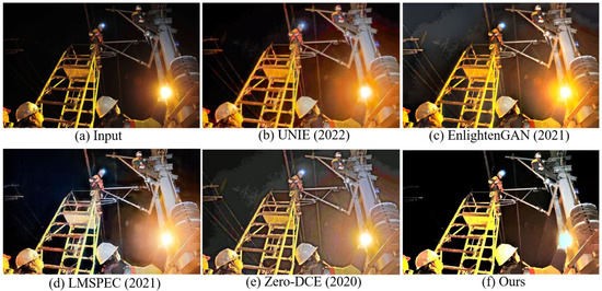Figure 12 and Figure 13 show a comparison experiment of the image enhancement of a low-light scene of an electric power operation with localized strong light. Our approach was superior to existing approaches in that it improved low-light images while preventing overexposure to strong light. It also provided better overall image visualization and noise control.