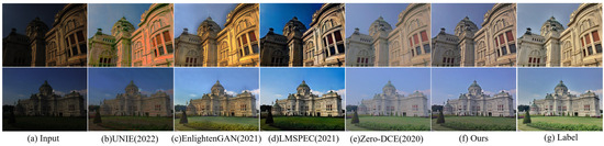 Image visualization is subjective, so we also used PSNR and SSIM as evaluation metrics and conducted comparison experiments using the SICE Part 2 public dataset. The metrics were calculated using MATLAB for the images enhanced by different methods and labeled images, respectively. PSNR and SSIM were taken as the average of 100 images. Figure 14 shows the visualization comparison with other advanced methods after low-light enhancement and Table 1 displays the findings from a comparison of PSNR and SSIM.