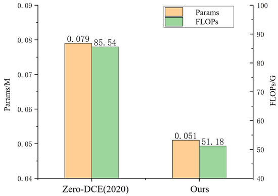 In order to lighten the network, we used depth-separable convolution to replace the ordinary convolution. The Params and FLOPs of the Zero-DCE low-light enhancement network based on the a kernel selection module (excluding the strong light judgment method and the light effect decomposition method) were substantially reduced compared with the original Zero-DCE. As shown in Figure 15, the Params were about 65% of the original and FLOPs were about 60% of the original when the input image size was 1200 × 900 × 3.