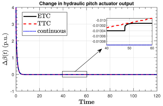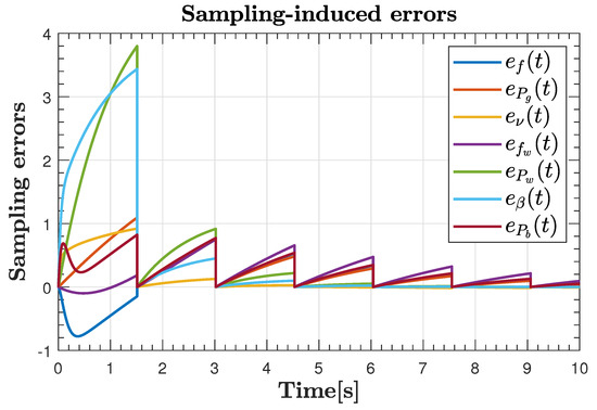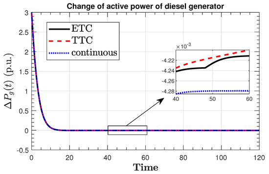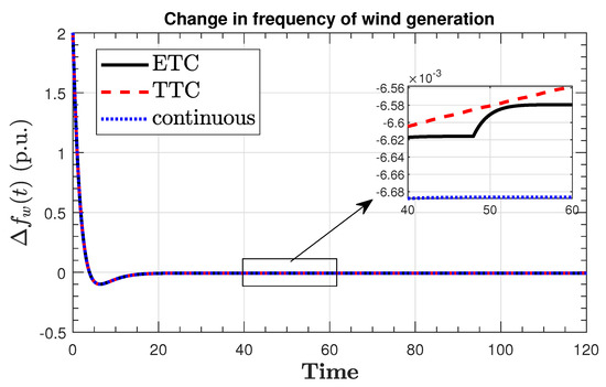Then, by using the MATLAB environment with the YALMIP toolbox and the SeDuMi solver [49], the following values are obtained from the solution of the LMI condition (13): , , , and s. Thus, all of the ETC parameters were established. Then, by using the hybrid dynamical systems MATLAB toolbox HyEQ [50], simulations of system (21) were executed with the arbitrary initial values , and for 120 s with random disturbances w. The resulting average and lowest inter-transmission intervals are s, respectively. The closed-loop response is shown in Figure 3, Figure 4, Figure 5, Figure 6, Figure 7, Figure 8, Figure 9, Figure 10 and Figure 11 for the continuous-time, time-triggered, and event-triggered controls. The simulation results show that the system frequency , the active power of the diesel generator , the active power of wind generation , the speed of governor valve , the frequency response of wind generation , the output response of the hydraulic pitch actuator , and the active power of the battery all converge to the origin in a short time. Figure 10 shows the sampling-induced errors of the system states, where the sampling errors are reset to zero at each transmission instant , according to (9). The generated transmission instants by the proposed ETC (12) are depicted in Figure 11, where the ETC generates inter-transmission times that are much larger than (more than 10 times) the sampling period s, demonstrating the effectiveness of the ETC in reducing the feedback transmission amount. Moreover, the state response shows that the event-triggered controller provides almost the same response as the continuous-time and triggered implementations while the transmission amounts are reduced.