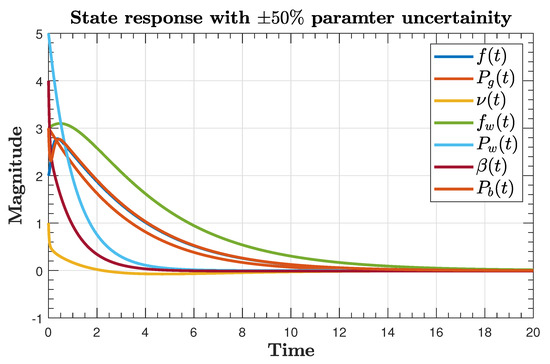 Figure 16 shows the state response when subject to parameter uncertainties. We see that all the system states converge to the origin, which supports the obtained robustness results.