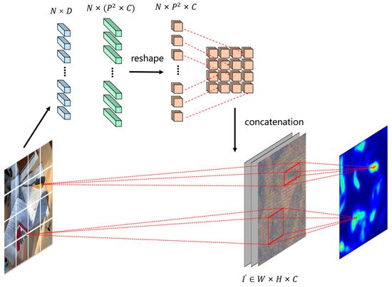 , each of which is an integration of its own location and of the whole. We arranged these vectors according to the spatial position of the original patches to obtain a feature map with the same resolution as the original image