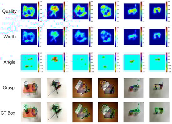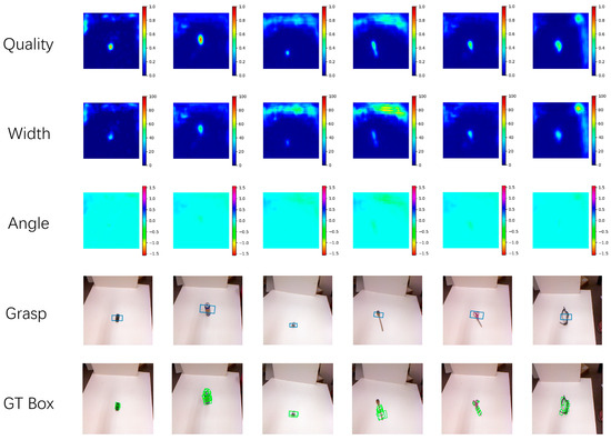 For the single-object grasping Cornell dataset, the highest score point in the quality map was set as the center of the grasping rectangle to obtain the corresponding width and angle. For the selected grasping pixel point, its index was recorded to find the width and angle of the corresponding position. Half of the width was set to the height of the grasp rectangle, and its corner points were easily solved with the angle value. The grasp detection results are visualized in the fourth row. The proposed method provides feasible grasps for objects with different shapes and positions, as shown in