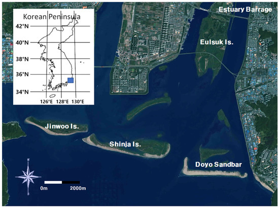 Data on coastal topography and offshore areas are crucial for interpreting spatial and temporal changes. In particular, the importance of coastal topography and offshore data has been recognized in the modern society with the development of the marine industries. The construction of large-scale artificial structures for dredging and landfilling in offshore areas alters the natural topography, leading to changes in water flow patterns, magnitude, wave characteristics, and other related factors. Such changes in hydraulic mechanics result in variations in sedimentation, causing alterations in the existing topography and substrates [1,2]. Estuarine areas possess particularly complex hydraulic characteristics, and artificial structures alter these hydraulic properties, leading to multifaceted changes in topographical features. In addition, estuarine areas are where seawater and freshwater mix, and considerable amounts of sediment, transported from upstream, are deposited as the water depth and velocity decrease, leading to the development of numerous sandbars, both large and small, parallel to the shoreline [3,4,5]. Shorelines are directly affected by the relationship between the discharge of suspended sediment and the flow rate of a river estuary. Monitoring changes in the shoreline is essential to conserve ecosystems, and the preservation of marine ecosystems is necessary for maintaining human livelihoods.
