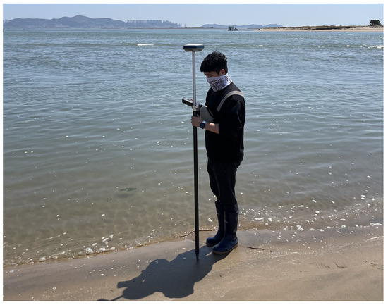 Shoreline surveys were conducted using Sokkia GRX1 and GSX2 Global Navigation Satellite System receivers (Sokkia Topcon, Atsugi, Japan), as shown in Table 2. The shoreline was surveyed at two sandbars formed by sedimentation. To obtain accurate results, a triangulation network was formed using nearby tidal benchmarks and adjusted accordingly. The survey was conducted at low and high tides based on tidal forecasts. The shoreline was measured every 10–15 m, and Figure 2 shows the surveying process. The results of the shoreline survey were processed using the Universal Transverse Mercator coordinate system, and the heights were based on Korean National Geoid 14. In addition, the data obtained through the field survey were compared with the data surveyed by period using the AutoCAD 2022 program, which is effective for creating 2D drawings or 3D object files by sketching/drawing and designing them with graphics software.