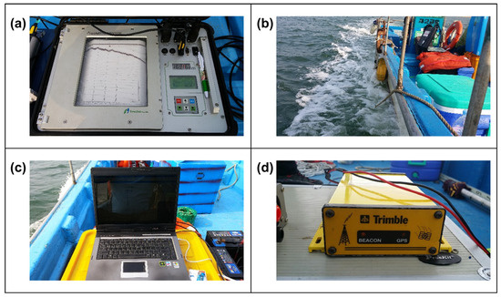 The bathymetry survey was conducted using the Aqua Ruler 200 echosounder from Sonar Tech Co., Ltd. (Busan, Republic of Korea). The detailed specifications of the equipment used are shown in Table 3. The bathymetry survey data were corrected for sound velocity and draft using the bar-check procedure. The tidal elevation was corrected using tidal data from the Gaduk Island tidal station of the Republic of Korea Hydrographic and Oceanographic Agency to convert the data to the Gadeok Island datum. The horizontal position of the offshore area was determined using Trimble’s Differential Global Positioning System, and both shoreline survey results and offshore horizontal positions were determined using the Universal Transverse Mercator coordinate system. Figure 3 shows the shoreline survey and seabed topography investigation system.