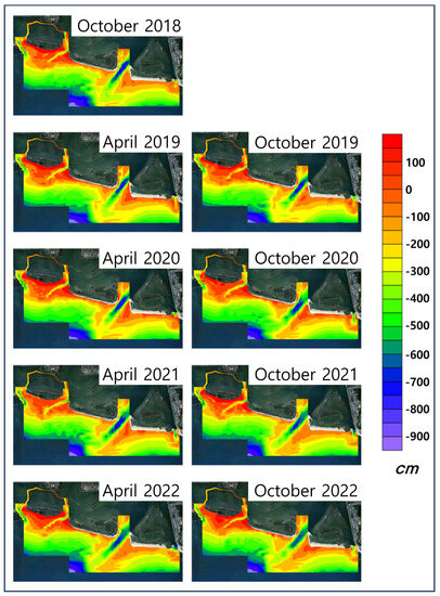 Overall bathymetric data (depth) for each survey time obtained in the survey area (October 2018–October 2022).