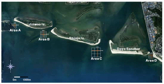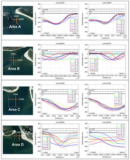 The sandbars in the study area are not connected to the mainland at either end, forming embayments. Therefore, channels are formed between each sandbar, and erosion and deposition trends in these channels were analyzed by dividing them into four sections from Area A to D, as shown in Figure 5. Each survey was conducted along three to five survey lines, spaced 100 m apart, in the north–south (vertical) and east–west (horizontal) directions, as shown in Table 4.