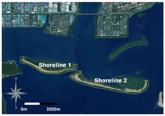 The analysis of shoreline changes was conducted in the coastal areas adjacent to Areas B and C (Figure 6; Shorelines 1 and 2, respectively), which are heavily influenced by the main stream of the Nakdong River. Figure 7 provides a detailed representation of the range of the shoreline changes.