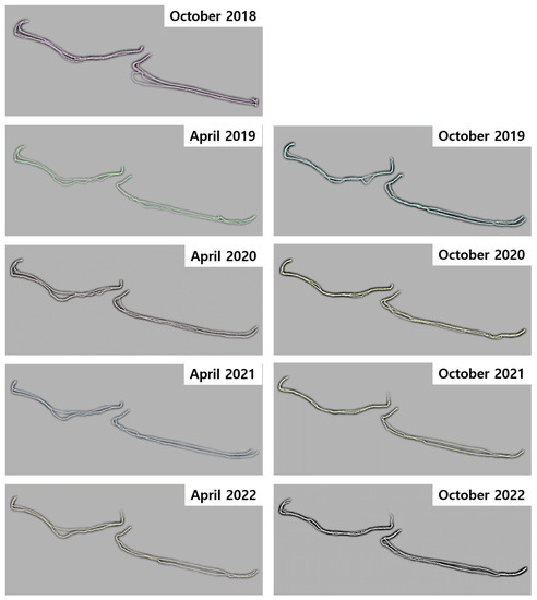 The analysis of Shorelines 1 and 2 performed using AutoCAD (Figure 8) showed that the range of the coastal indentations is changing owing to differences between high and low tides. For Shoreline 1, the shape of the terrain changed based on the tide level, with the reference point being October 2020. This is considered to be associated with changes in the terrain caused by the typhoons MAYSAK and HAISHEN that passed through Republic of Korea in 2020. As shown in Figure 9, in October 2020, it was confirmed that Shoreline 2 was interrupted and a channel was formed.