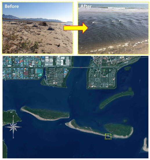 - Jung, S.H.; Khim, B.K.; Kim, B.O.; Lee, S.R. Shoreline-change rates of the barrier islands in Nakdong river estuary using aerial photography and SPOT-5 image. Ocean Polar Res. 2013, 35, 1–14. [Google Scholar] [CrossRef]