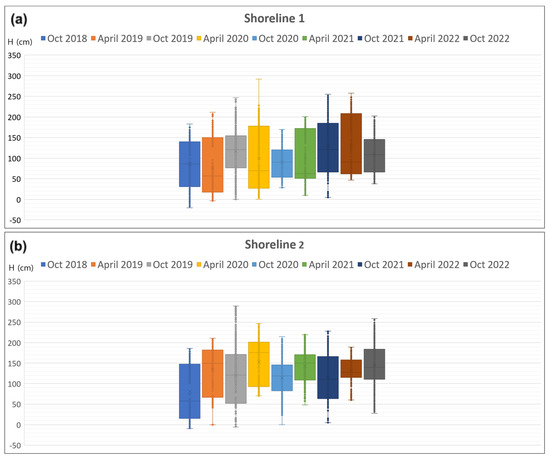 Distribution changes in the height (H) for Shorelines 1 and 2. (a) Shoreline 1: Jinwoo Island; (b) Shoreline 2: Shinja Island. Severe distortion is possible if there is an abnormality in the shoreline data of traditionally widely used methods, such as average or standard deviation for shoreline changes.
