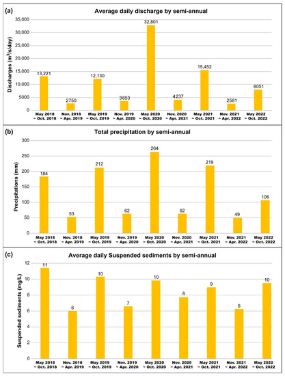 Time series of semi-annual data for the duration of the study (K-WATER, KMA). (a) Average daily discharge; (b) total precipitation; and (c) average daily suspended sediment outflow.