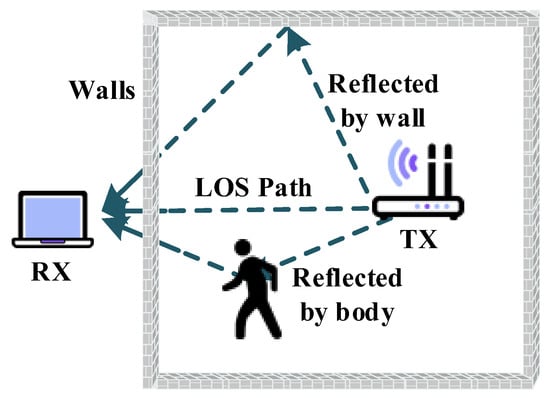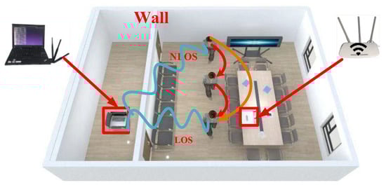 Research on human detection using Wi-Fi signals has received much attention recently. However, most of the early work was related to something other than through-the-wall detection. Recently, through-the-wall sensing has received much attention because it can monitor human activities without privacy and security [2]. With powerful capabilities across different rooms, through-the-wall sensing can provide an application solution for elderly monitoring, intruder detection, and emergency rescue [3]. Recent works on device-free human detection can be divided into two main categories: active mode and passive mode. The difference between the two is that the active mode requires outdoor devices to send RF signals indoors continuously. In contrast, the passive mode can always obtain the Wi-Fi signals sent by indoor Wi-Fi devices and thus conduct human detection, which can more easily obtain the state data of indoor personnel. The passive mode shown in Figure 1 allows easy acquisition of Wi-Fi signals sent by indoor Wi-Fi devices [4] for human detection. As the human body moves through the space between various Wi-Fi devices, the Wi-Fi signal is refracted, reflected, and diffracted through the human body. The resulting signals are in a different state than those generated after passing directly through an interfering object. These signals have different levels of interference, based on which we can distinguish whether a person is in the room. Due to the movement of a person, the Wi-Fi signal may pass through a wall via the LOS path or the NLOS path, both of which receive different signal strengths. We can also roughly determine the location and status of a person based on this method.
