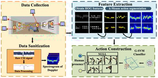 We divided the system proposed in this paper into four main parts: data collection, data processing, feature extraction, and active construction. The system flow is shown in Figure 4. In the data collection part, we selected multiple wall materials (concrete wall, plaster wall, wooden door, glass wall) and used a TP-LINK router and a commercial laptop device equipped with an Intel 5300 NIC to communicate in the experimental scenario with different wall materials: the router as the transmitter and the laptop as the receiver. The receiving device records and stores the raw CSI action signals. The data preprocessing part requires the raw CSI data to be processed and converted into Doppler shifts. First, outlier removal is performed on the raw CSI action data using the Hampel filter, and denoising is performed using a discrete wavelet transform. Then, the correlation extraction of CSI is performed using the OR-PCA algorithm to remove complex noise from other obstacles and walls. Finally, the subcarriers with significant waveforms are converted into Doppler shift maps. The feature extraction part first uses the K-Means algorithm to segment the central part of the action in the formed Doppler shift image and then extracts the HOG feature of the segmented image as the feature vector of the action, which is convenient for use in the human body detection and recognition stage. In the human detection and recognition stage, the G-SVM classifier optimized by the grid search algorithm is used to classify and identify the images after feature extraction, and finally output the human detection results.