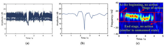 Then, the selected optimal sub-carrier is converted into a Doppler frequency shift, as shown in Figure 5c. It can be seen that there is no change in the Doppler image when the previous action does not start, which is similar to the Doppler frequency when no one exists. This is also a critical performance to distinguish whether there is someone indoors.