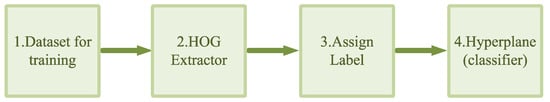 We sequentially acquired RGB images from the Step 1 dataset to extract features at Step 2 (using the HOG algorithm). We divided the data into two categories, training set and test set, from which 80% of the data samples were selected as training samples and 20% as test samples. The final feature vector was formed by combining the HOG descriptors of all the blocks in the detection window, and then fed to the G-SVM classifier as input features. Based on the characteristics of the input images, labels continued to be assigned to each corresponding image at step 3 (a label of 1 corresponds to an image where a person is present; a label of 0 corresponds to an image where no person is present). Then, at step 4, based on the G-SVM algorithm, these were used to train on the Matlab tool, thereby obtaining hyperplanes for classification.