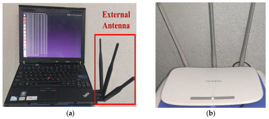 This paper used a commercial TP-Link wireless router and a Thinkpad x201 laptop equipped with a Wi-Fi network card as the experimental equipment. As shown in Figure 8, the Wi-Fi network card was an Intel Wi-Fi Link 5300 with 3 antennas as the receiver, and the router is a TL-WDR5300 with three antennas as a transmitter for sending CSI signals. To collect CSI measurements, we installed the Linux CSI tool [22] on a laptop. In our experiments, the transmitter operated in the 5 GHz band using a 20 MHz channel bandwidth. To ensure communication quality, the notebook computer was equipped with an extended antenna, and the signal gain was 6 dB. At the same time, the CSI measurements obtained from the Linux CSI tool were processed using MATLAB.