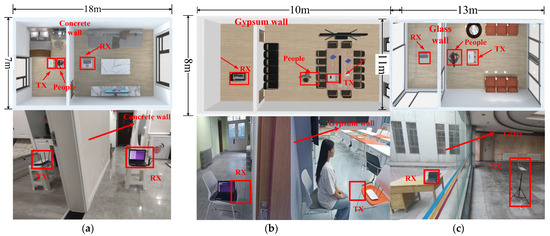 Experimental scenes of walls with different materials: (a) Concrete wall; (b) Glass and wooden door material; (c) Gypsum wall material.