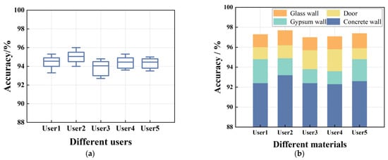 To verify the influence of different users on the experimental effect. We selected a total of 5 volunteers to participate in the experiment, including 2 females and 3 males. As can be seen from Figure 10a, the recognition accuracy of the three male users of user 1, user 2, and user 5 was usually higher than that of the two female personnel of user 3 and user 4, but the overall average accuracy was small. Figure 10b shows the results of the recognition accuracy of different users using the walls of different materials. It also demonstrated that the recognition accuracy of male personnel was indeed higher than that of female personnel in general. However, the influence of different testers on the final detection accuracy of the experiment was relatively small. We also used four kinds of walls for experimental verification. It can be seen that the average recognition accuracy rate was the highest when passing through the glass wall, followed by a slightly lower recognition accuracy rate when passing through the wooden door. Due to the gypsum wall and concrete wall structure being more complex, the recognition accuracy through the gypsum wall is lower than that through the door, and the recognition accuracy through the concrete wall is the lowest. The final experimental results showed that under the condition of different wall materials, different experimenters had different final detection accuracy of the experiment. The experimental accuracy of glass walls was the highest, and the experimental accuracy of the concrete wall was the lowest. In the case of the same wall material, the experimental accuracy of the user was not much different, thus verifying the stability of the system performance.
