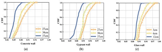 Cumulative distribution functions of various materials with different thicknesses: (a) CDF of the concrete wall; (b) CDF of the gypsum wall; (c) CDF of the glass wall.