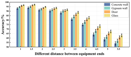 Table 2 shows the recognition accuracy under different wall materials. It can be seen that the recognition accuracy rate of the glass wall material was the highest, and the effect was the best. The accuracy rate of the wooden door and gypsum wall material was slightly lower, and the accuracy rate of the concrete wall material was the lowest. However, the recognition accuracy rate was more than 90%, which was a better result.