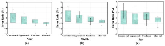 To verify that the different positions of the personnel had a particular impact on the experimental results, we selected three positions with different distances from the device, as shown in Figure 13: close to the device, in the middle position, and far away from the device. The three positions were separated by 1.5 m and were verified in the walls of four materials: glass, wooden door, gypsum, and concrete. The errors in different personnel positions are shown in Figure 13. Figure 13a shows the error ratio of different wall materials when approaching the equipment. The error ratio of glass walls was lower than that of wooden doors, followed by gypsum walls, and the most significant error was concrete material. When using the same material wall to conduct experiments, it can be seen that the error ratio of the position close to the equipment was smaller than that of the intermediate position and the position far away from the equipment. The final results showed that when the human body was close to the device, the error ratio was the smallest, the recognition accuracy rate was the highest, and the experimental effect was better. When the human body was far away from the device, the error ratio was the largest, the recognition accuracy rate was the lowest, and the experimental effect was worse. To obtain better results, the location of the personnel is crucial and needs to be as close to the equipment as possible.