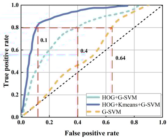 In order to prove that the combined algorithm of Kmeans+HOG+G-SVM (KHG) used in this paper was better than the single algorithm for classification and to verify the reliability and high performance of the method proposed in this experiment, we used the ROC curve as an evaluation criterion, thus analyzing the effectiveness of the KHG classification method. The results are shown in Figure 14. With the simultaneous use of Doppler shift, we compared the two classification methods without using the K-means clustering method and only using the G-SVM algorithm. From the comparison results, it can be seen that, when the actual positive rate (TPR) reached 0.8, the KHG method proposed in this paper had a false positive rate (FPR) of 0.1, which was the best performance, and the FPR of the method without using the K-means clustering method reached 0.4, which was slightly lower than that of KHG. The FPR of only using the G-SVM method reached 0.64, which was the worst performance. From the comparison results, we see that the KHG method in this paper had the best performance, and the method using only the G-SVM method without HOG feature extraction had the worst performance, indicating that the combination algorithm was better than a single algorithm for classification.