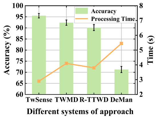 In order to verify the processing efficiency of these several systems using the methods, we compared the running time of several systems, as shown in Figure 15, from which it can be seen that the average recognition accuracy using the TwSense method was 95.5% and took 2.8 s; the average recognition accuracy using the TWMD method was 92.4% and took 4.2 s; the average recognition accuracy using the R-TTWD method was 90% in 3.7 s; the average recognition accuracy using the TW-See method was 71.2% in 5.6 s. In terms of processing time and accuracy, TwSense had a significantly lower processing time than the other systems, a higher recognition accuracy than the other systems, and the highest processing efficiency.