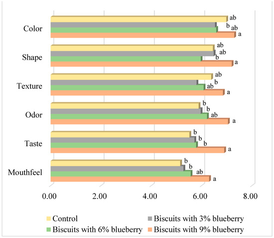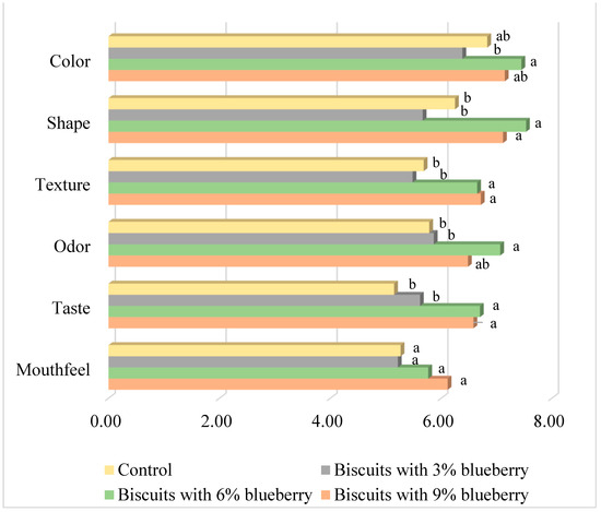 Sensory attributes of enriched biscuits with blueberry powder. a, b means with different letters next to the bars are significantly different for percentage of plant extract (p < 0.05).