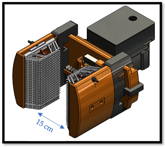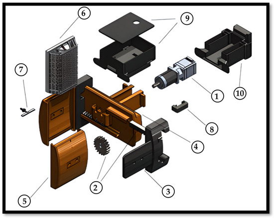 The mechanism of this gripper is made of ten different parts, as shown in Table 1 and Figure 1, excluding the electrical components. The gripper operates by a high-torque stepper motor (1) and a 22.5W (max) power bank. The output rotational motion of this motor will be changed to the linear motion of the gripper by using a rack–pinion system (2). The rack is merged into a handle (3) at the end and slides inside the rail in the main body (4) of the gripper. The handles will be covered by the grasping segment, which includes a hard shell (5) and a flexible element (6). A custom lock mechanism (7) is implemented to keep the flexible element securely inside the hard shell, while a stop (8) is added to maintain the handle’s position on the main body. Also, for the controlling system of the gripper and other electrical components, a specific box (9) is designed which will be attached to the back of the main body. The box is secured to the body through a connection piece (10) that is also able to attach directly to the robotic arm.