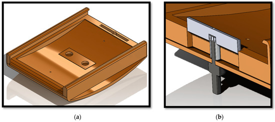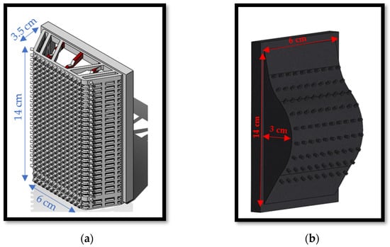In this design, the surface was extended downward and past the edge of the gripper, allowing it to potentially grasp small and thin objects like coins. Bumps were incorporated to increase the friction between the object and the end effector. This design is capable of easily grasping objects of any size and shape within a range of 7 cm width difference, with an upper limit of 15 cm (for instance 1–8 cm, 5–12 cm, etc.). The rectangular flexible element with a mesh design is shown in Figure 4a.