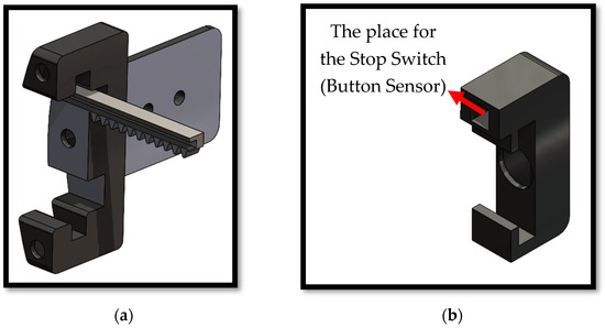 The gripper is equipped with handles that serve the dual purpose of supporting both the hard shell and the flexible component. Each handle incorporates a properly sized rack and is designed to smoothly slide along the integrated rail within the main body. This sliding motion is facilitated by the interaction between the racks and the pinion system, causing the handles to move in opposite directions. For secure fastening of the hard shell, each handle is equipped with two holes where bolts can be inserted and tightened. To prevent accidental displacement of the handles from the main body, flexible stops, including a stop switch, were developed and affixed to the ends of the main body. Figure 3a visually illustrates the handle design, while Figure 3b depicts the rubber stop mechanism.