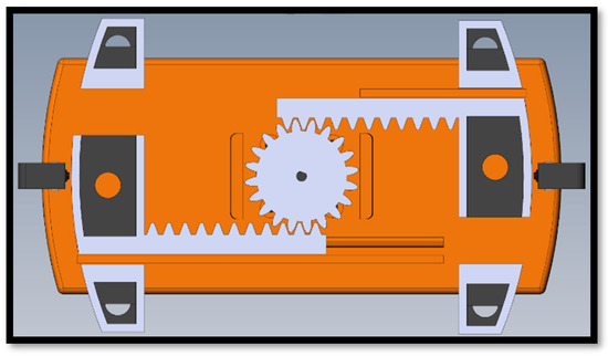 Prior to manufacturing a prototype of the rack and pinion system, a CAD model was created to visualize and analyze the components. A simple support beam analysis was conducted to assess the performance of this gear system. In the design, a spur gear was chosen with a diametral pitch of 25.4 cm (10 in) and a pressure angle of 20 degrees. Similarly, the rack was designed with the same diametral pitch and pressure angle. The motion analysis was performed within the CAD software, and the results were validated with printed parts with a 3D printer. The final design of the rack and pinion system can be observed in Figure 6.