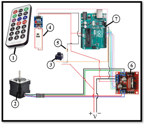 The electrical components are listed in Table 2, and Figure 7 illustrates their connections. This gripper can be controlled either manually through remote control (#1) or programmed using the robotic arm. The gripper can perform motion between a closed position for grasping objects and an open position for releasing them. The gripper’s motion is facilitated by a stepper motor (#2), which controls the steps involved in transitioning between the two positions. To ensure accurate positioning and prevent step losses in the motor, a switch button (#3) is integrated into the gripper. This button serves to reset the gripper’s position after each release and calibrate it for the next grasping task. In this design, a single button is sufficient due to the synchronized movement of the gripper arms, operated by the pinion–rack mechanism.