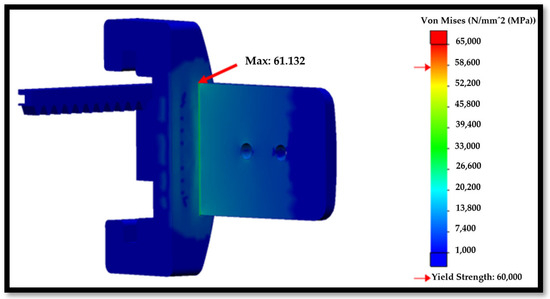 The flexible element is connected to the handle, and therefore, the entire grasping force will directly transfer to the handle. The most vulnerable part of the handle is the end of the connection part to the gripper hard shell, which experiences maximum torque. Through a SolidWorks stress analysis, and based on the current material (NYLON Carbon 12) and the thickness of the parts, it is found that the handle can withstand a maximum force of 220 N. This force is also equivalent to the maximum force that can be applied by the motor. The result is presented in Figure 8.