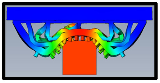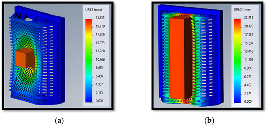 The minimum force required for the complete deformation of the flexible element during object grasping is crucial for successful gripping. However, this force is influenced by factors such as the thickness, shape, size, and orientation of the object, making it difficult to directly measure. Therefore, a simulation study was conducted to estimate the maximum allowable thickness by subjecting square or rectangular objects of various sizes to the flexible element with different thicknesses. It was found that a thickness of 0.3 cm required a force of 186 N for full deformation, which falls within the safe maximum stress limit of the hard shell when considering a safety factor of 1.183. Simulation studies were also performed to analyze displacement forces, calculate von Mises stress, and determine the factor of safety for the flexible element. The deflections of the flexible element with a thickness of 0.3 cm during grasping of square- and rectangle-shaped objects are shown in Figure 9 and Figure 10.