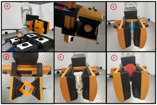 (a) Grasping an orange, (b) grasping an egg, (c) grasping a super glue bottle, (d) grasping a cube, (e) grasping a unique glass pitcher, and (f) grasping a gear.